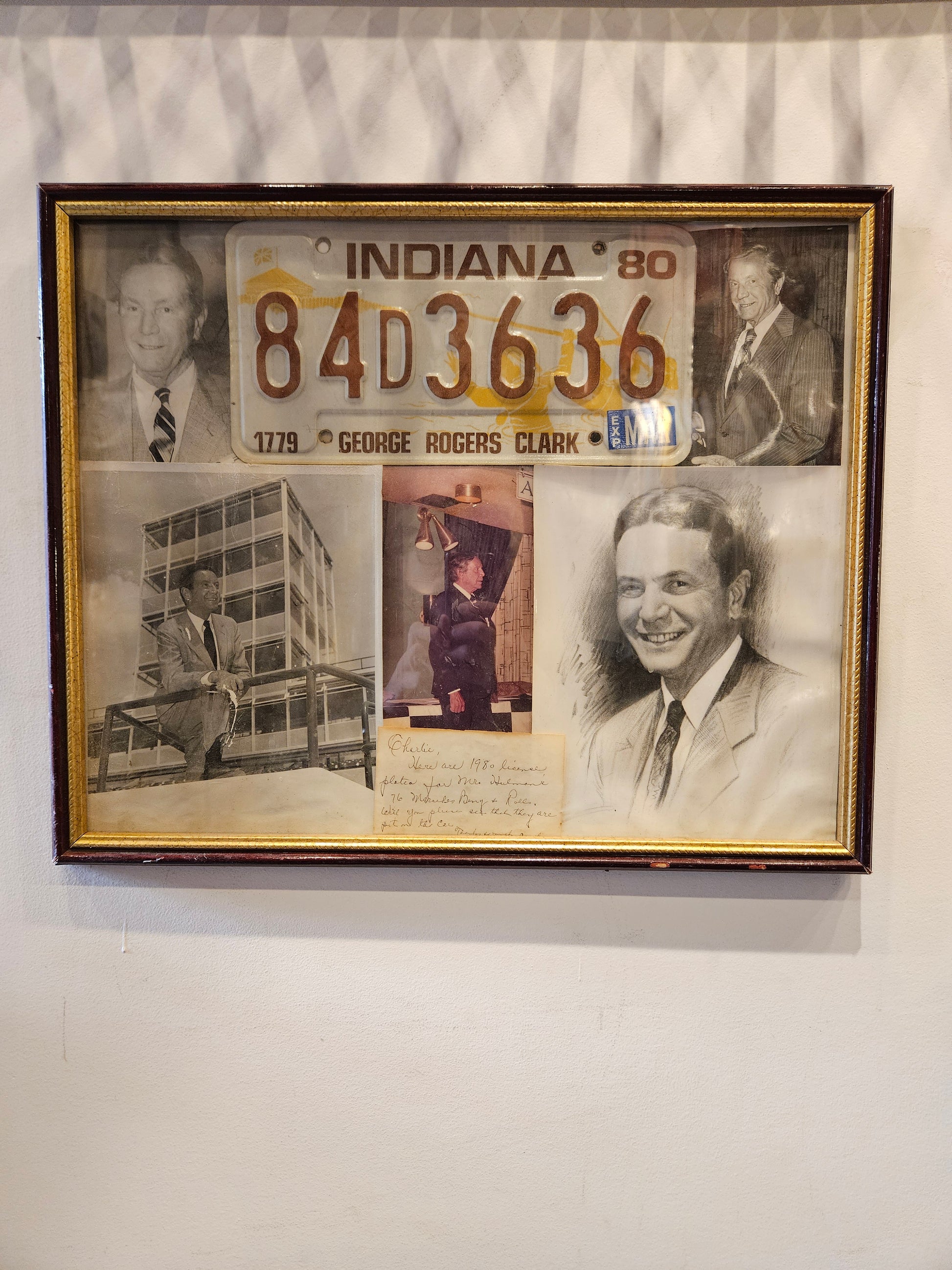 Out of an estate in Indianapolis. Hand painting depicting race car driver. A series of black and white photos from the Indy 500 and a license plate from 1980 with images of owner and signed letter.